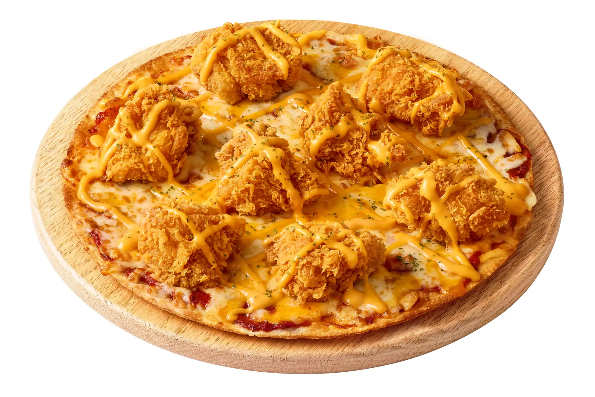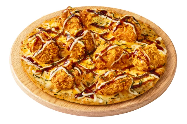サクサクのサイチキンを贅沢にトッピングし、特製オリジナルソースが絶妙に絡み合う一品。クリスピーな生地との調和が楽しめます。